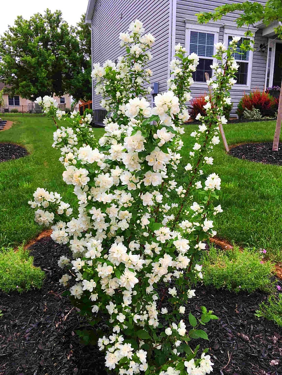 Приобретение этого сорта жасмина станет одним из лучших декоративных решений для вашего сада! Поверьте! Аккуратный невысокий кустарник с изящно изогнутыми побегами и листвой насыщенного зеленого цвета. В середине июня куст покроется крупными махровыми цветками, до 8 см в диаметре, белоснежными с перламутровым блеском и необыкновенно приятным ванильным ароматом. Растение очень неприхотливое, зимостойкое. Одним словом, драгоценность!