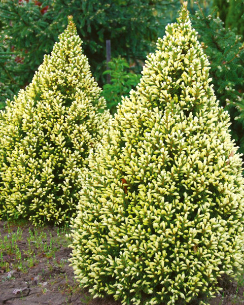 Карликовый хвойный кустарник с симметричной конической кроной, отличающийся необычной игрой красок в течение сезона. Весенние приросты нежного желто-кремового оттенка создают эффект свечения, постепенно переходя в светлый голубовато-зеленый тон, что придает растению особую декоративность.