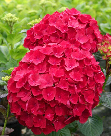 Яркие шапки соцветий крупнолистных гортензий (Hydrangea macrophylla), диаметром 20–30 см, заметны издалека. Для кустов типична округлая форма. В сравнении с другими разновидностями она более чувствительна к холодам, поэтому обращайтесь с ней бережно, и тогда она сполна отблагодарит вас. Цветочные почки формируются осенью и подвержены воздействию первых заморозков, но их можно защитить, накрыв двойным слоем лутрасила или пленкой для теплиц. Растения можно культивировать в контейнерах, использовать для одиночной и групповой посадки в саду, а также в качестве срезочной и комнатной горшечной культуры. На зиму требует укрытия, порог морозостойкости без укрытия −17–23 °С.