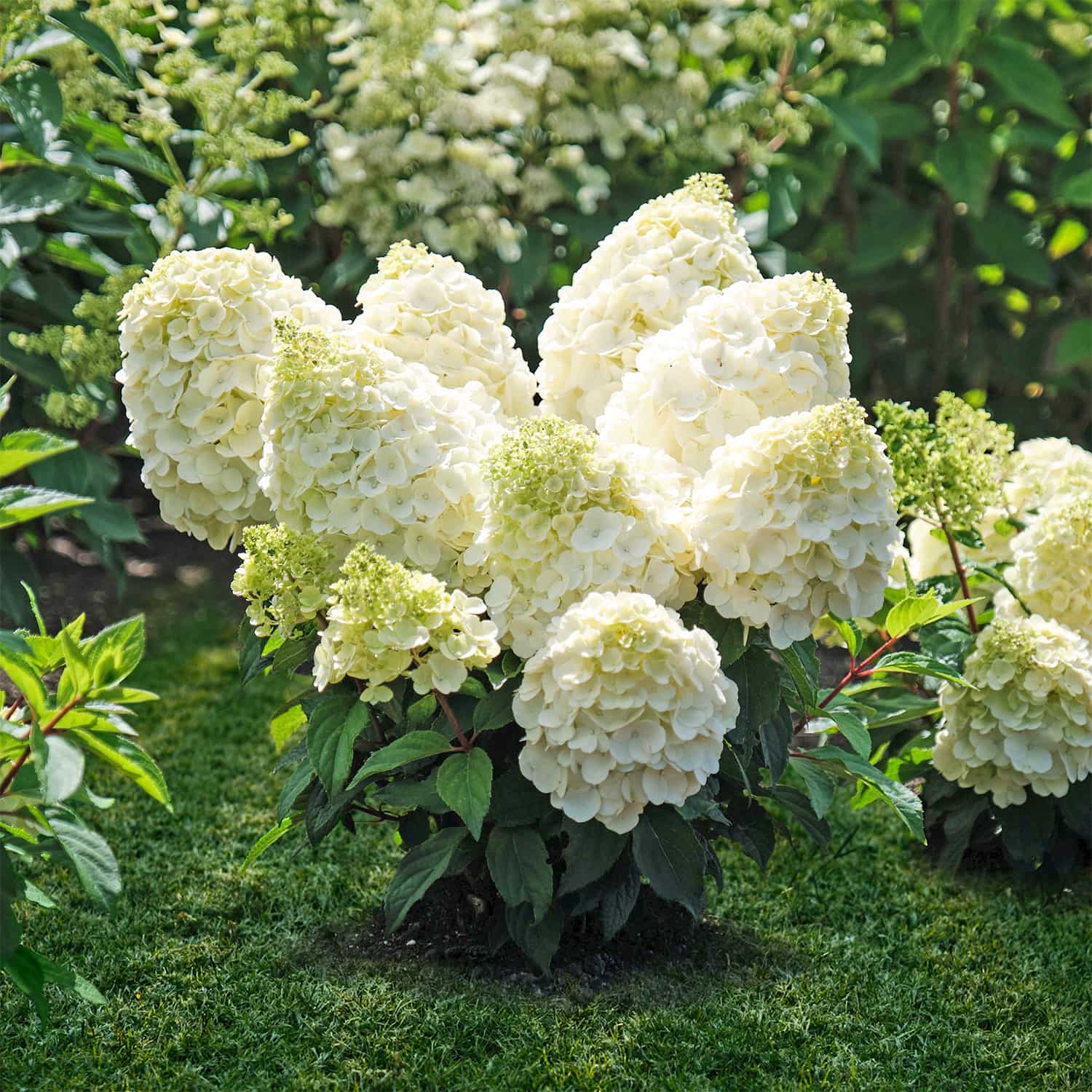 Гора Монблан на вашем участке. Неординарные широкопирамидальные соцветия с очень крупными плотно посаженными цветками(!), как будто вырезанными из бумаги, имеют потрясающий, даже магический эффект. Метелки длиной более 35 см очень красивого цвета - он чисто-белый в нижней части и лаймовый в верхней. Плотное расположение вертикальных ветвей с этими массивными “шапками” придает кустарнику завораживающую неподвижность. Все побеги характеризуются одинаковыми размерами, не требуют опоры. Сорт дымо- и газоустойчив. Зимостойкость до -35°С.