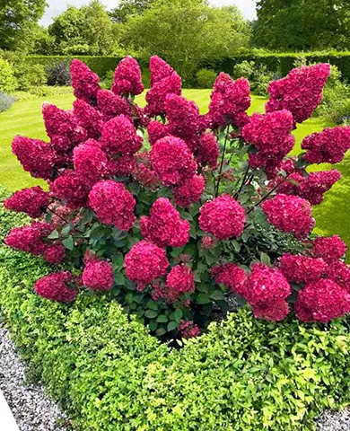 Эта гортензия – несомненный фаворит среди садоводов России и абсолютный лидер по продажам. Ее куст невозможно перепутать с другими, благодаря свисающим тяжелым соцветиям длиной до 15 см, которые выделяются своей особой красотой. В начале цветения они молочно-белые с зелеными кончиками, но в течение лета окраска меняется от светло-розовой до ярко-розовой. Ближе к осени они приобретают насыщенный рубиновый оттенок, который сохраняется до первых морозов. Сочетание исключительного внешнего вида и тонкого аромата оставляет неизгладимое впечатление. Куст сохраняет форму и не разваливается. Зимостойкость данного сорта на высшем уровне.