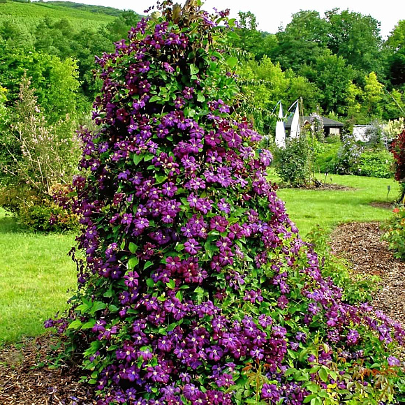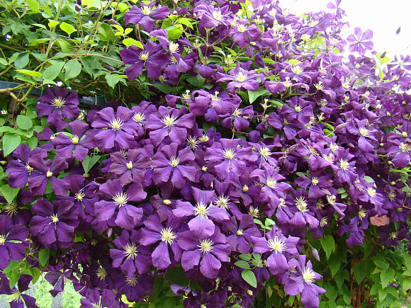 Необычайно выразительный обильноцветущий ампельный сорт с темно-фиолетовыми бархатистыми цветками. Цветки крупные, до 15 см в диаметре, звездчатой формы, по 4–6 лепестков в бутоне. Сливочного цвета тычинки с золотистой пыльцой нежно контрастируют с яркими насыщенными лепестками. Этот клематис обильно и долго цветет на побегах текущего года, густо оплетая любую опору. Подходит для заборов, арок и пергол, особенно хорош рядом со светлыми кустарниками и розами. Зимостойкость до –34 °C.