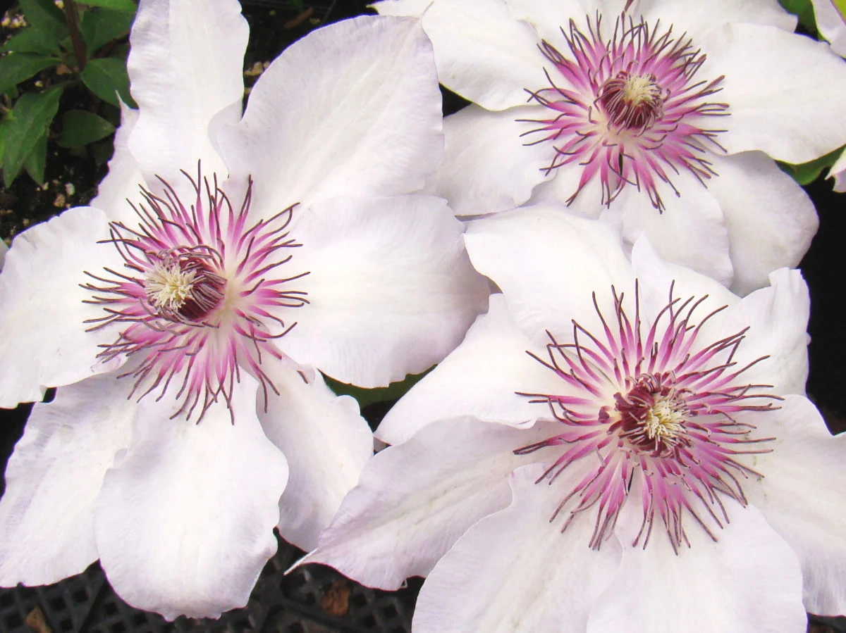 Крупные цветки этого сорта похожи на звезды и источают приятный аромат. Лепестки белые, волнистые, с контрастной полосой посередине, тычинки фиолетовые. Цветет в мае – июне на прошлогодних побегах, затем в августе – сентябре на новых. Эффектно смотрится в сочетании с розами.