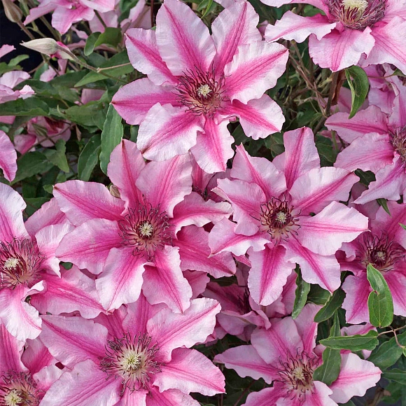 Нежно-розовые крупные цветки диаметром 8–12 см, с лиловыми полосами по центру лепестков и темно-красными тычинками, создают воздушный, романтичный образ. Цветет двумя волнами: на прошлогодних и новых побегах. Отличается устойчивостью к жаре и болезням, эффектно украшает арки и перголы.