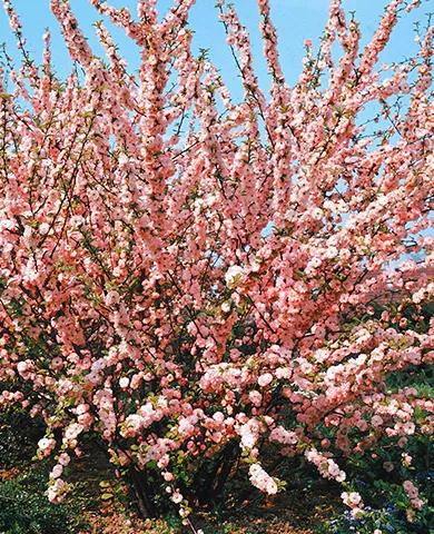 Чудесный живописный кустарник, известный как китайская махровая слива. Весной привлекает внимание своими махровыми бледно-розовыми цветками с темным центром. Эти изящные «розочки» так густо покрывают ветви, что даже маковому зернышку не найти места. Картина цветущего миндаля в течение двух недель просто завораживает сказочной красотой! Куст отличается раскидистостью ветвей, но очень хорошо переносит обрезку. Зимостойкость до −30 °С.