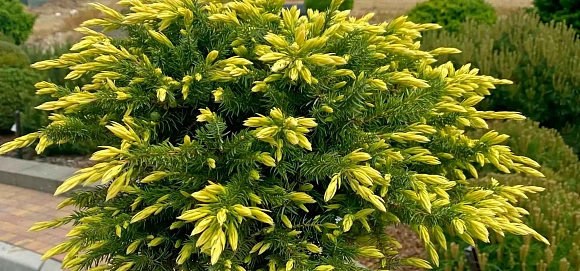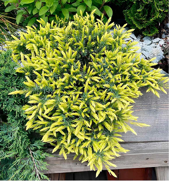 Упругий коврик с золотисто-желтой хвоей, которая со временем меняет цвет на серебристо-зеленый. Не боится сильных ветров, засухи и соли, поэтому отлично подходит для прибрежных садов. Разрастается медленно, достигает диаметра 100 см, лучше всего чувствует себя на каменистых возвышенностях.