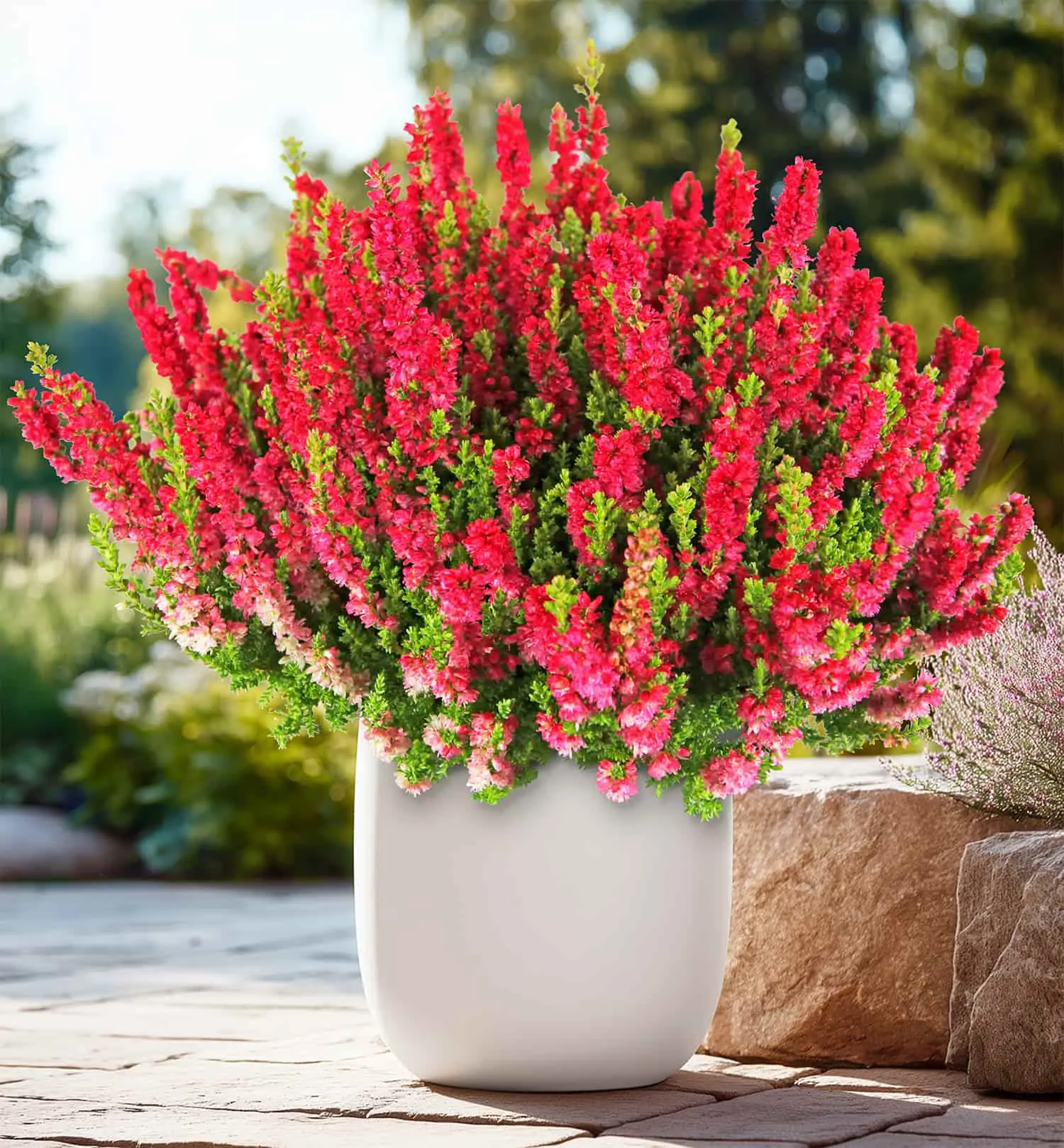 Один из самых эффектных вересков: густые кисти полумахровых, темно вишневых, почти рубиновых цветков контрастно выделяются на фоне насыщенно-зеленой листвы. Куст компактный, вертикальный, разрастается медленно. Создает выразительный акцент на клумбе или в рокарии.