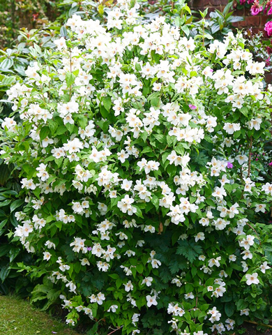 В лепестках этих белоснежных колокольчиков словно спрятан теплый розовый отблеск, чуть заметный у основания – как тайна, раскрывающаяся только вблизи. Насыщенный аромат со сладкими земляничными и фруктовыми нотками добавляет очарования. Со временем листва приобретает лимонный оттенок, добавляя яркости в зеленую гамму сада. Цветение очень обильное, куст невысокий, аккуратный. Выдерживает морозы до −27 °C, при повреждении легко восстанавливается весной.