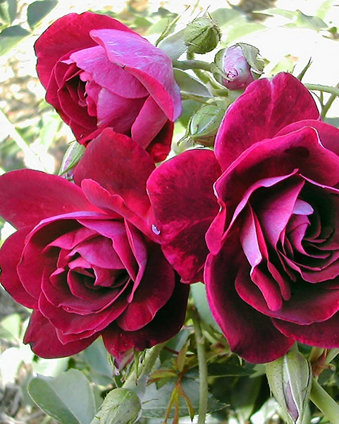 Стоит увидеть окраску воочию, чтобы поверить, что она и в самом деле такая. Это густо-сливовый, почти мистический цвет. Лепестки бархатной текстуры. Отличается невероятной обильностью цветения. Аромат ненавязчивый с нотками гвоздики и меда. Цветение интенсивное и непрерывное. Распустившиеся бутоны держатся на побегах довольно долго. Диаметр цветка 7 – 8 см. Куст компактный, густой, шаровидный. Зимостойкость до −–30 °С.