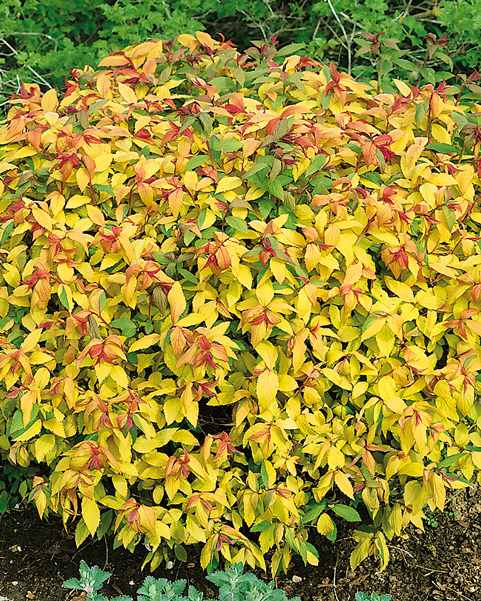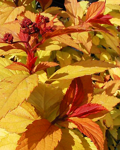 Мимо не пройдешь от восхищенья! Ее прямостоящие побеги скрыты под шапкой листвы самой разнообразной расцветки: на одном кусте могут быть салатовые, бронзовые, ярко-желтые, красно-коричневые и медно-оранжевые листья. Лист продолговатый, по краю зубчатый, 5–8 см длиной. Окраска зависит от количества солнечного света и меняется в течение сезона. Цветет обильно ярко-розовыми соцветиями, собранными в щиткообразные кисти. Цветут кусты почти все лето.