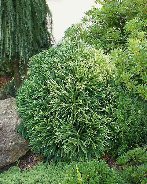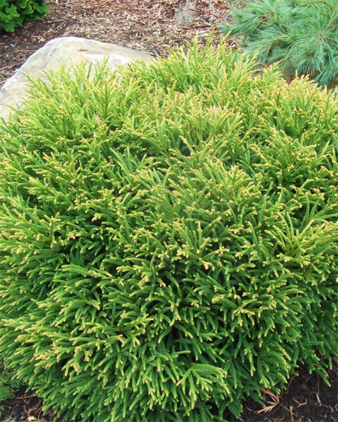 Компактный шаровидный канадский сорт туи с «лохматой» густой сочно-зеленой хвоей, которая осенью приобретает бронзово-золотистые оттенки. Прекрасный вариант для создания живого бордюра. Растет медленно. Раз в несколько лет завязывает шишки. Хорошо переносит стрижку и формовку. Зимостойкость до −40 °С.