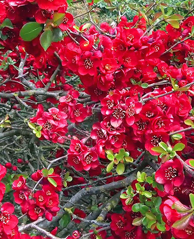 Многочисленные ярко-красные цветы диаметром 3–6 см распускаются на этом кустарнике в конце мая, когда листочки еще совсем маленькие, что позволяет в полной мере насладиться красотой цветения. Ароматные крупные плоды достигают зрелости в начале октября. На солнечном месте цветение становится более обильным.