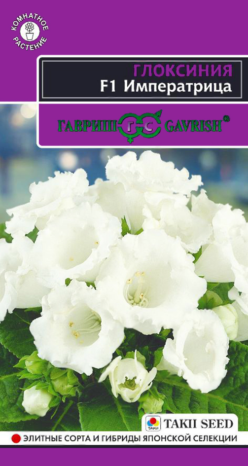 Семена Глоксиния Императрица. Роскошное и очень модное среди цветоводов комнатное растение из семейства Геснериевые. Цветки колокольчатой формы, нежно-белые, с приятной бархатистой поверхностью венчают длинные цветоносы. Широкоовальные листья на коротких черешках украшают основание цветоноса. На взрослом растении образуется 10-15 крупных цветков, создавая впечатление нарядного букета. Глоксиния предпочитает светлые, солнечные места без воздействия прямых солнечных лучей.