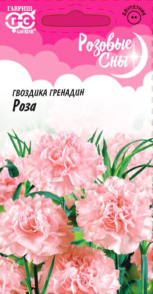 Семена Гвоздика садовая Гренадин Роза. Популярное двулетнее травянистое растение для любительских цветников, формирует хорошо развитые кустики 50-60 см высотой. Стебли прямые, тонкие, коленчатые, облиственные. Листья узколинейные, прикорневые собраны в основании куста в розетку. Листья и стебли покрыты серебристо-сизым налетом. Цветки розовые, махровые, до 5 см в диаметре, расположены на концах побегов, с тонким ароматом. Цветет обильно на второй год после посева с июля по август. Неприхотлива, холодостойка, предпочитает солнечные участки с легкой, плодородной, некислой почвой.