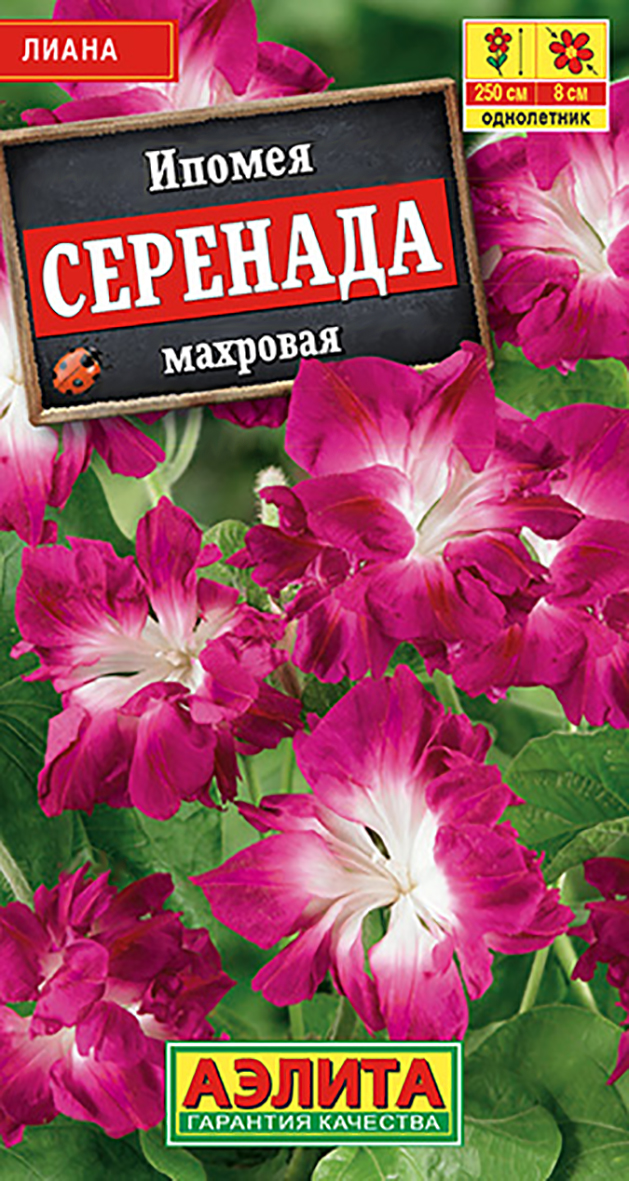 Семена Ипомея махровая Серенада. Чудная вьющаяся лиана с красивыми листьями и нарядными, полностью махровыми, гофрированными цветками богатого вишнево-красного цвета. Цветки остаются открытыми значительно дольше, по сравнению с обычными сортами. Растение способно взобраться по любой опоре и соткать на ней живой ковер удивительной красоты. Она будет достойным украшением подпорных стенок и беседок. Агротехника. Посев в открытый грунт в конце мая предварительно замоченными семенами, гнёздами по 2-3 шт, с шагом 30 см. Всходы появляются на 5-7 день. Цветение с середины лета до заморозков. Можно сеять на рассаду в горшочки в конце апреля, это ускорит цветение на 3-4 недели. Влаго-, свето-,теплолюбива.