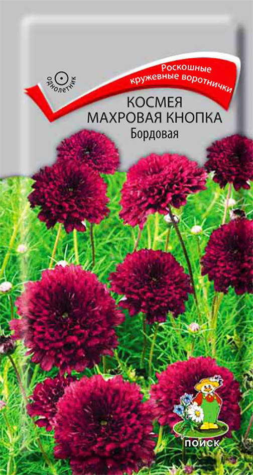Семена Космея Кнопка Бордовая Махровая. Махровые цветки роскошного бордового цвета! Декоративное растение с ажурными сильнорассеченными листьями, высотой около 80 см. Соцветия – махровые корзинки диаметром 7-10 см на крепких стеблях. Великолепно выглядят на клумбах и в бордюрах, особенно большими массивами. Прекрасный материал для срезки. Агротехника. Растение светолюбивое, холодостойкое. К почвам не требовательно, но лучше растет на легких почвах. Посев семян производят в апреле-мае непосредственно в открытый грунт. Для более раннего цветения возможен посев на рассаду в марте. Глубина заделки семян 1 см. При температуре почвы +18°C всходы появляются через 8-14 дней. Расстояние между растениями 30-35 см. Семена соответствуют требованиям международных стандартов и ГОСТу РФ 12260-81