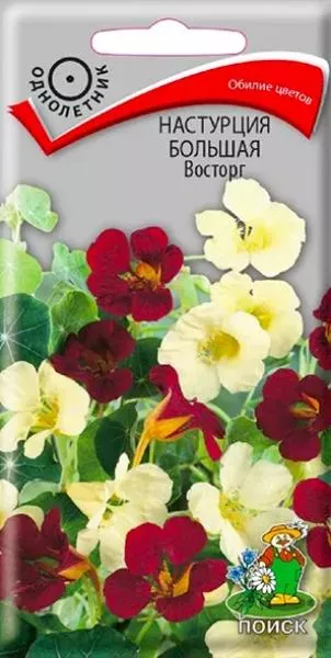 Семена Настурция Большая Восторг. Обилие цветов. Полу стелющиеся побеги длиной до 1,5 м. Смесь белых и красных цветов. Шпорцы длинные, чуть изогнутые. Цветет обильно с июля до заморозков. Используют для вертикального озеленения, балконных ящиков.