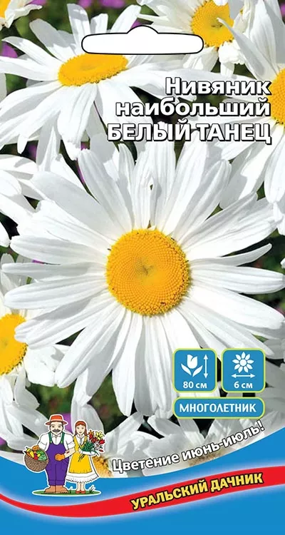 Семена Нивяник Белый танец. Популярное растение, которое известно под названием «ромашка». Высота до 80 см. Крупные, в диа- метре 6 см, цветки с белыми широкими лепестками и жёлтой серединой.
